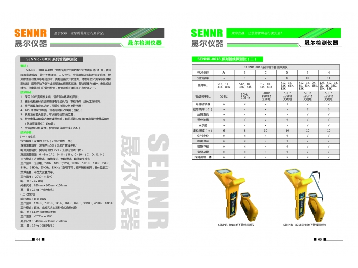 測量深度:10M 測量精度:5% 管線故障點檢測(選配) SENNR-8018系列地下管線探測儀由專業研發團隊精心打造,融合超窄帶濾波器、藍牙無線通訊、GPS定位、專業資料分析軟體自動成圖、檢測報告自動生成等先進技術,具有超強抗干擾能力、精准定位和測深等優異探測性能,適用於地下各種金屬管線的探測和巡線,管線管理與維護,市政規劃建設、供電等部門的管線檢測,是管道維護單位的必備儀器之一。